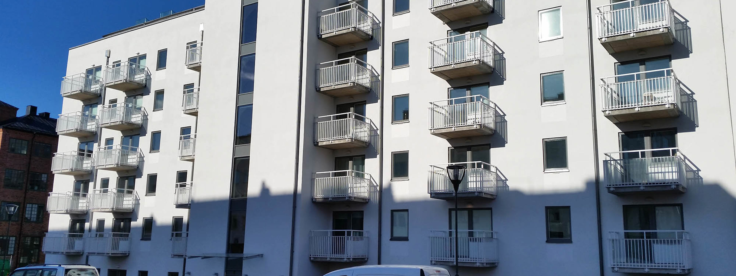 Nyproduktion av Flerbostadshus, stomme av betong. Fasaden isolerades med mineralull & putsades med Weber EF puts.